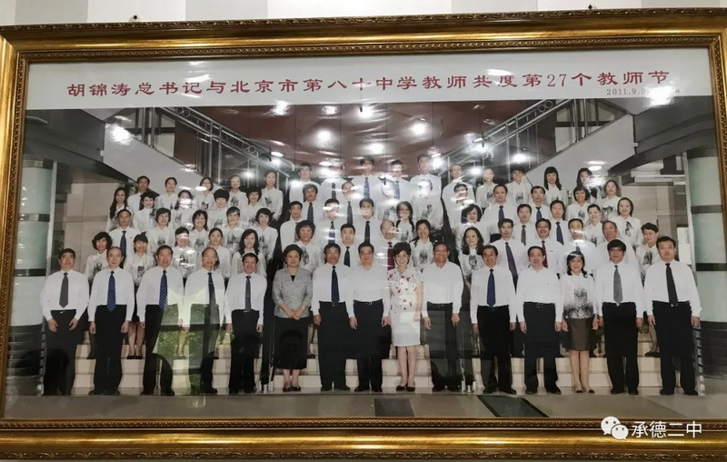 2011年(nián)9月(yuè)10日(rì)教師(shī)節來(lái)臨之際,胡錦濤總書(shū)記來(lái)北(běi)京市(shì)八十中學,與李寶∑辛書(shū)記和(hé)田樹(shù)林(lín)校(xiào)長(cháng)及學校(xiào)中層領導、教師(shī)代表合影(yǐng)。
