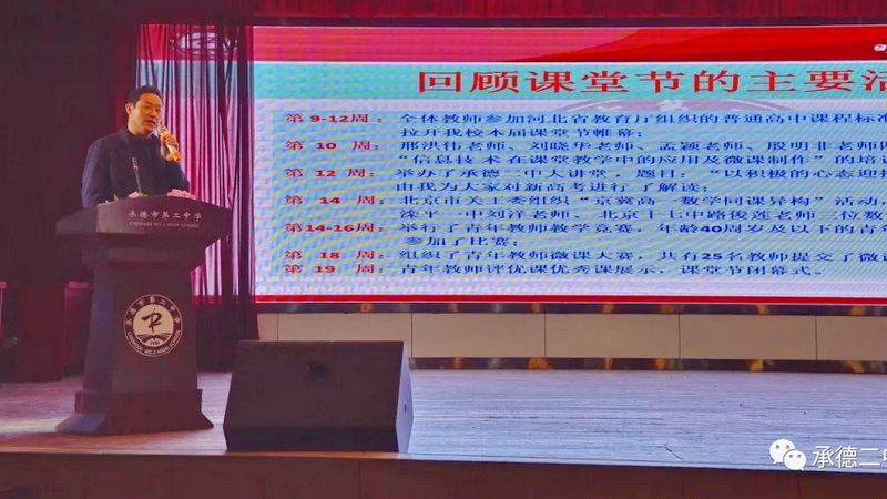 12月(yuè)26日(rì),我校(xiào)在報(bào)告廳舉行(xíng)了(le)第四屆課堂節閉幕式。閉幕式由教務處主任馮岩α主持,校(xiào)長(cháng)郭常森(sēn)、副校(xiào)長(cháng)劉守傑、副校(xiào)長(cháng)孫劍峰、↑紀委書(shū)記徐光(guāng)宇和(hé)全體(tǐ)教職工(gōng)參加了(le)活動。特别邀請(qǐng)北(běi)京市(shì)第八十中學原黨委書(sh₩ū)記李寶辛、北(běi)京師(shī)範大(dà)學在讀(dú)研究生(shēng)校(xiào)§長(cháng)助理(lǐ)單堅開(kāi)、承德縣頭溝中學校(xiào)長(cháng)彭淑傑及教師(sh ī)代表參加閉幕式。