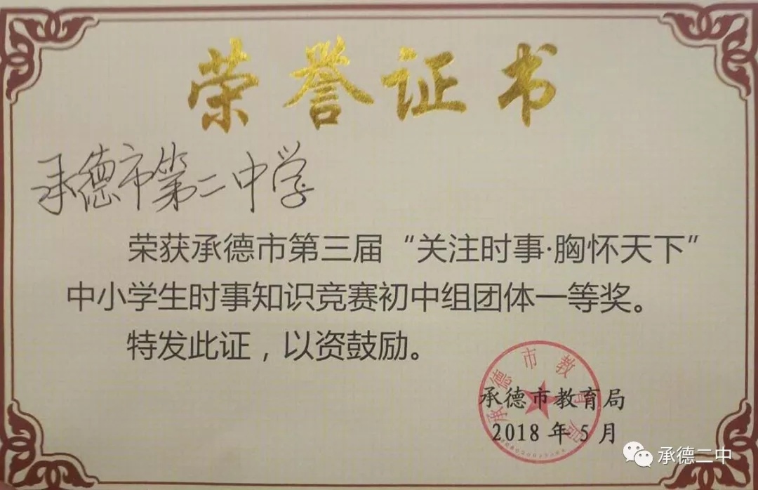 由承德市(shì)教育局組織的(de)第三屆"關注時(shí)事(shì),胸懷天下(xià)"知(zhī)識競賽于5月(yuè)16日(rì)圓滿落幕,此次比賽共有(yǒu)包括我校(xi♥ào)初中部代表隊在內(nèi)的(de)16支隊伍參加,我校(xiào)初中代表隊精心準備,團結協作(zuò),蟬聯冠軍!