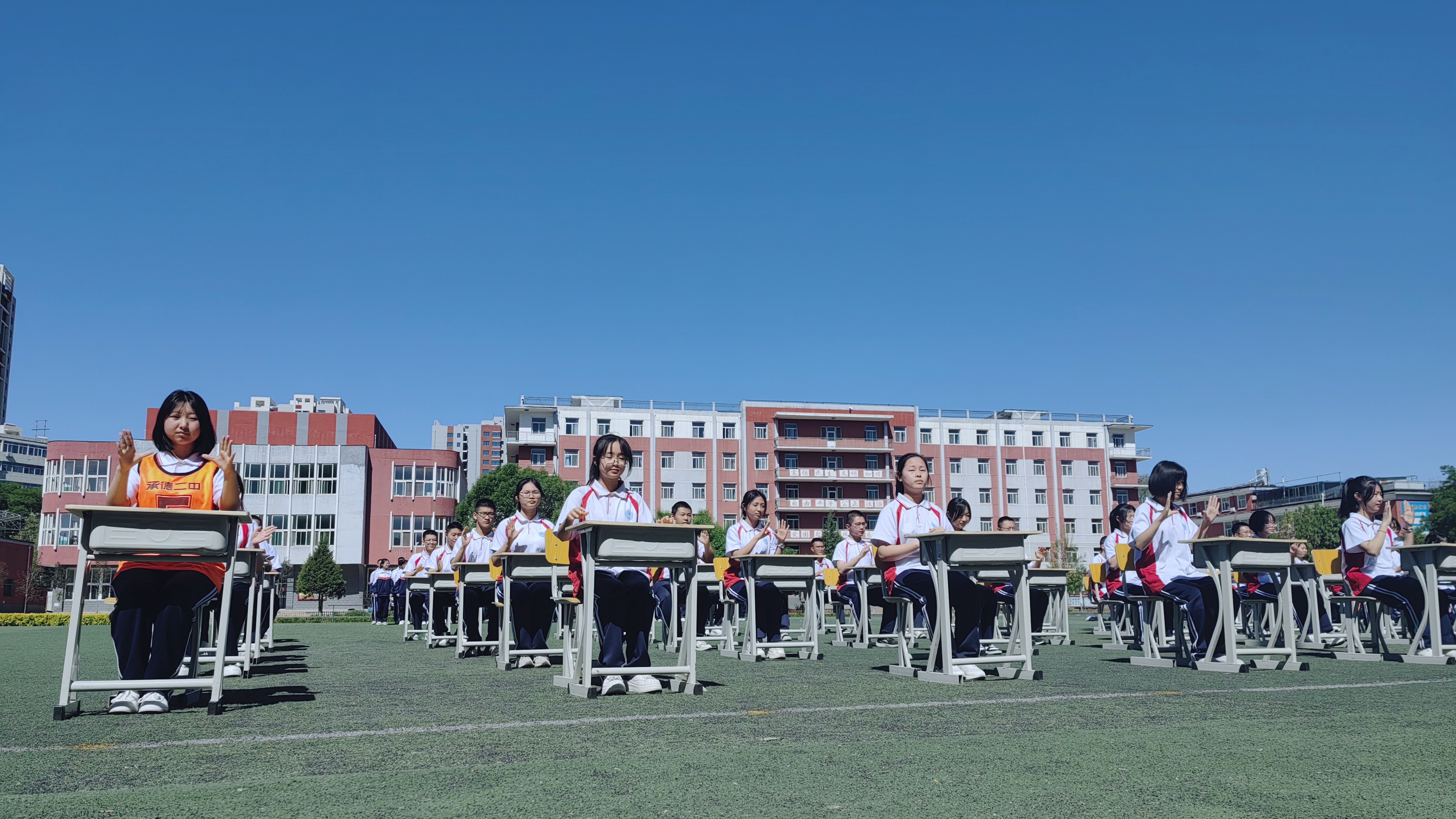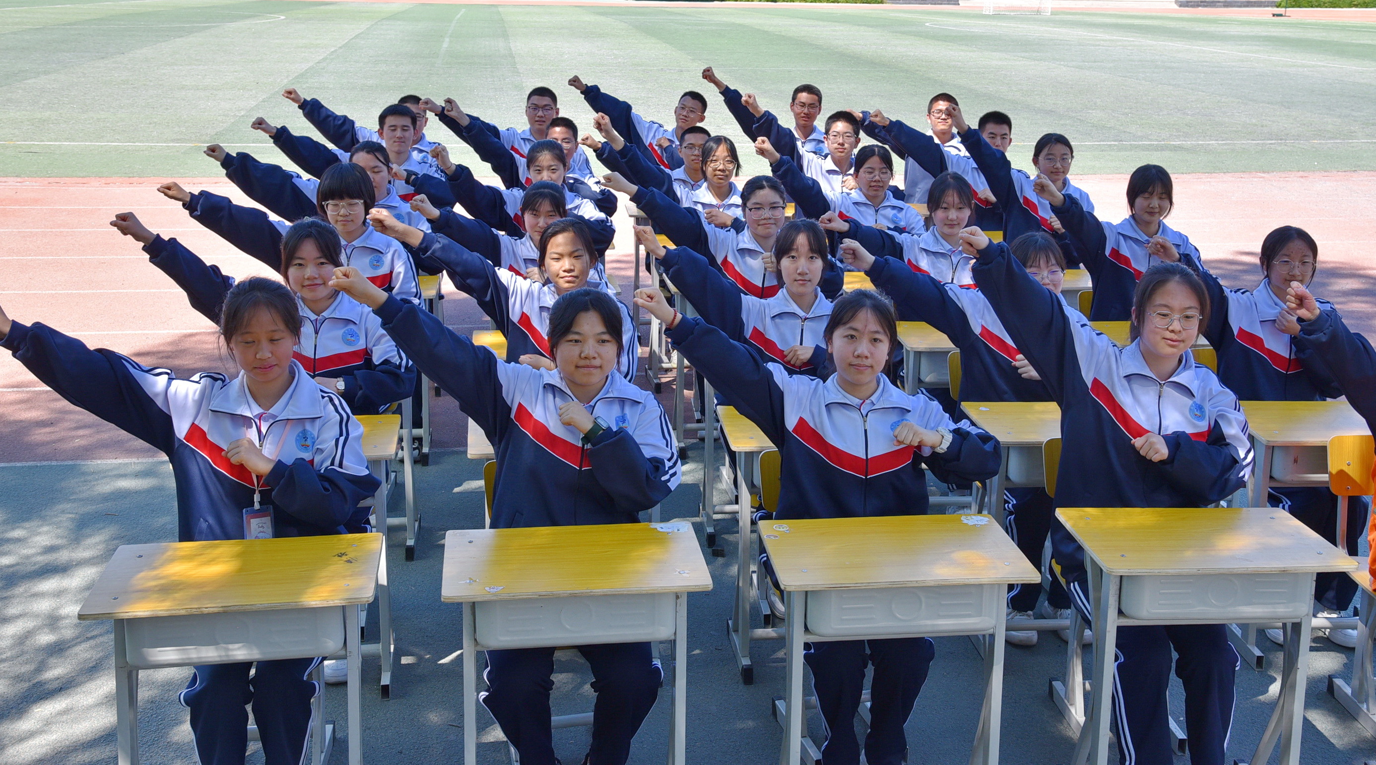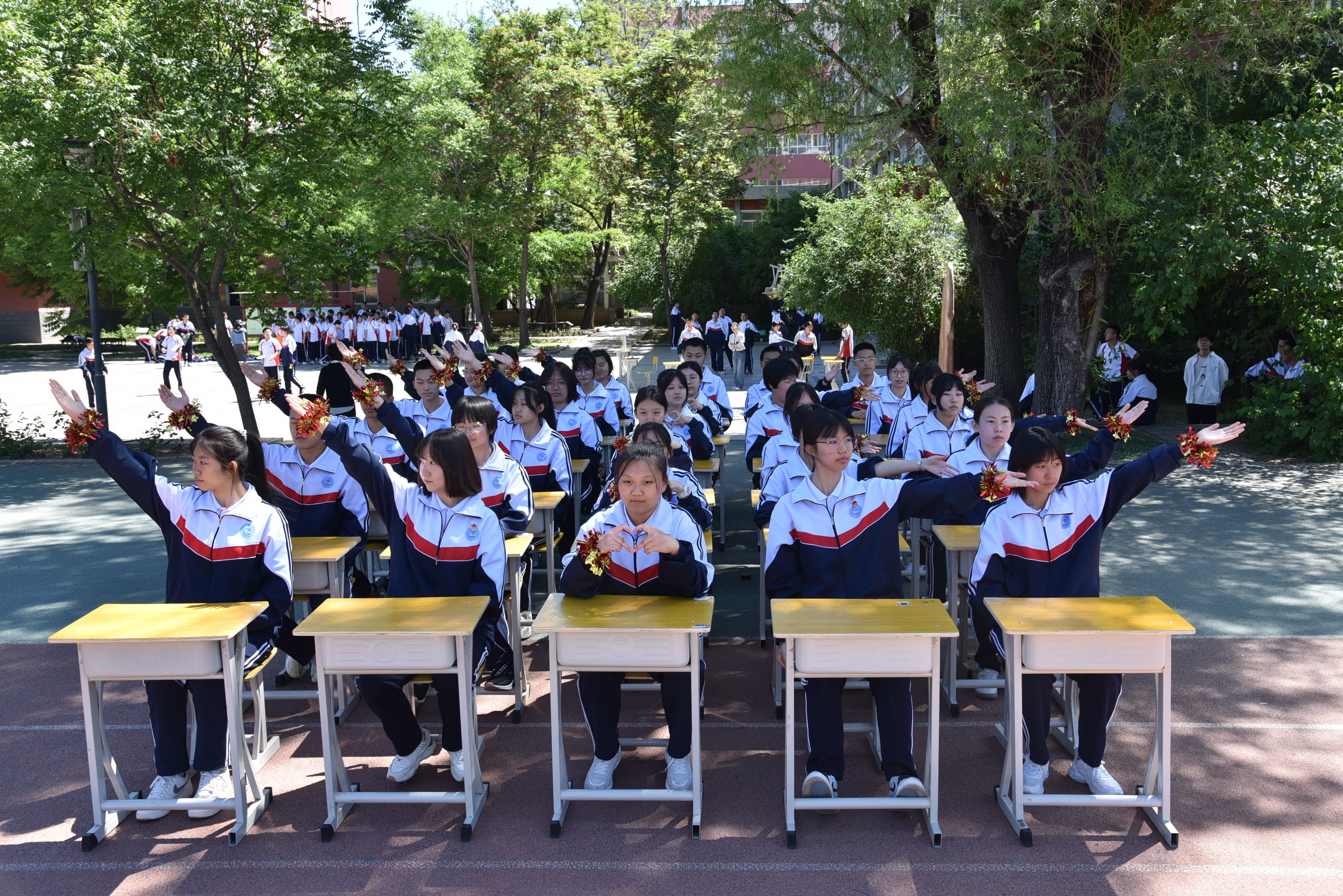 一(yī)道(dào)道(dào)弧線在指尖流動,一(yī)張張笑(xiào)臉在眉間(jiān)綻放(fàng)。課桌舞(wǔ)是(shì)同學們每天開(kāi)啓下(xià)午課的(de)“醒腦(nǎo)操”。伴随著(zhe)铿锵的(de)音(yīn)樂(yuè)響起來(lái),飛(fēi)揚的(de)青春便在方寸課桌間(jiān)舞(wǔ)動起來(lái)。同學們把課桌搬到(dào)操場(chǎng),盡情展示班級風(fēng)采,他(tā)們的(de)動作(zuò)整齊劃一(yī),精神飽滿昂揚,盡顯青春的(de)朝氣與活力。