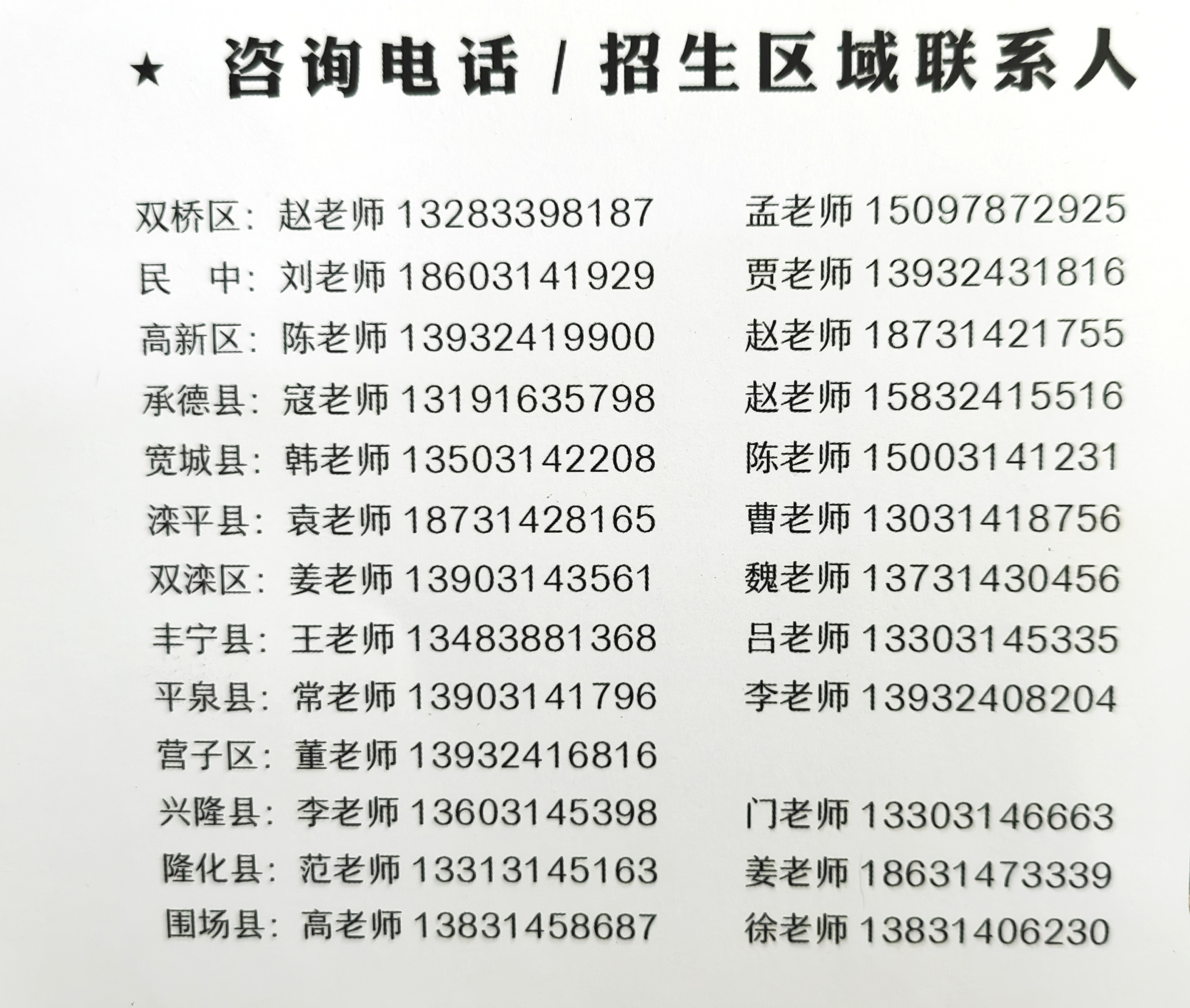 1.到(dào)學校(xiào)報(bào)名:中考成績公布當天考生(shēng)持中考成績截屏、準考證到(dào)承德二中報(bào)名,錄滿為(®wèi)止。地(dì)址:承德市(shì)雙橋區(qū)南(nán)園路(lù)9号乘6路(lù)、16路(lù)、17路(lù)公交車(chē)到(dào)桃李街(jiē)南(nán)口下(x✘ià)車(chē)