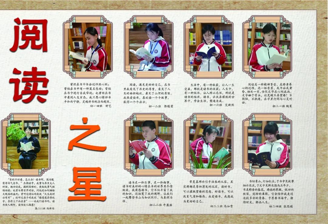 學校(xiào)為(wèi) “閱讀(dú)之星”設立專欄展闆,分(fēn)享讀(dú)書(shū)感悟與體(tǐ↓)會(huì),讓更多(duō)的(de)學生(shēng)感受到(dào)閱讀(dú)不(bù)僅是(shì)獲取知(zhī)識的(de)手段,更是(shì)提升自(zì)我修養的 (de)途徑,享受生(shēng)活的(de)方式。
